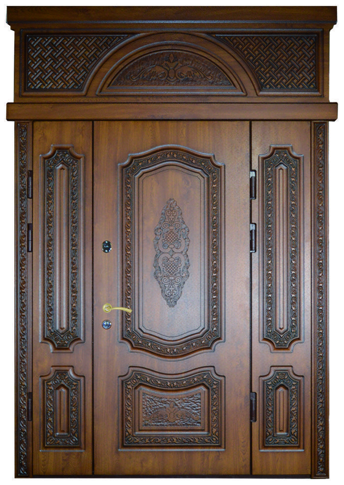 Парадные двери относятся к изделиям премиум-класса. Изготавливаются такие модели из металла толщиной не менее 2,0 мм, конструкция усиливается ребрами жесткости. Основной фактор, делающий парадные двери таковыми – их внешняя отделка. Для декора этих дверей, как правило, используют массив дуба, ясеня или сосны, натуральный шпон, корабельную фанеру, МДФ-панель, покрытую атмосфероустойчивой пленкой Винорит (VINORIT). Декоративные вставки из антивандального стекла, с применением элементов ковки, рисунок, который будет сочетаться с рисунком решеток на окнах, придаст коттеджу неповторимый внешний вид. Можно декорировать дверь витражным узором – и ваш дом заиграет яркими красками. По конструкции парадные двери могут быть как одностворчатыми, так и двустворчатым. При достаточной высоте проема, можно изготовить входную группу с декоративной вставкой сверху – прямоугольную или в виде арки. Терморазрыв в конструкции парадной двери сохранит тепло в доме, и предотвратит промерзание и кондедсирование двери в холодное время года, при этом не требуется обустройство в доме холодного тамбура.